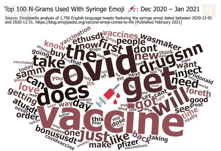 疫情时期,💉彻底换了一层含义。根据Emojipedia所截取的、2020年12月至2021年1月期间的1756条英语推特,和💉结合使用的常用词,变成了“COVID-19”“疫苗”,以及“辉瑞”“莫德纳”等欧美疫苗厂商的名字。上文提到的“微生物”、“戴口罩的脸”等符号,也会同💉一起出现。