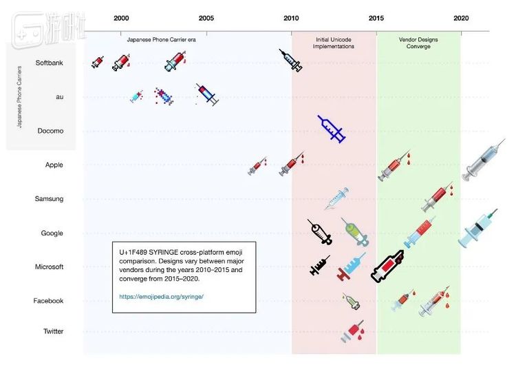 自1999年首次加入表情符号大家庭以来,💉一直用于形容“注射”或“献血”行为。此后,欧美厂商计划引入类似的表情符号,同时兼顾和日本电信运营商的兼容性。2008年,谷歌的一份提议和日本表情符号兼容的文件,就明确要求💉得“带点血”(with blood)。