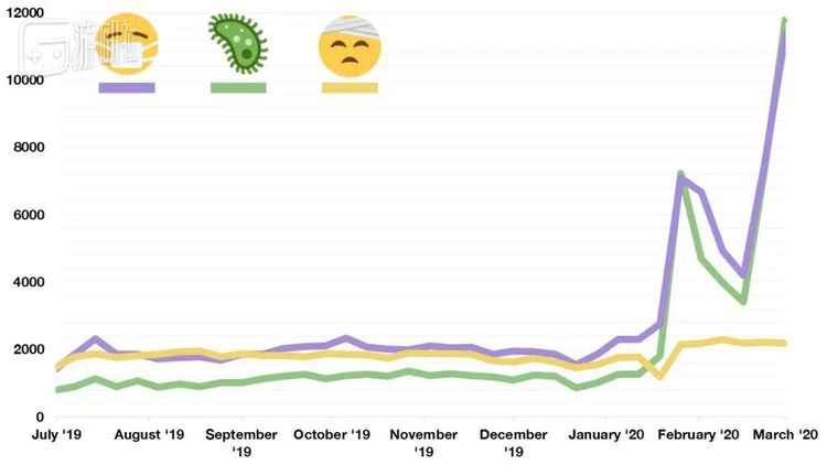 根据Emoji百科网站Emojipedia的多项数据统计,有一部分Emoji的使用率在疫情期间显著上升。