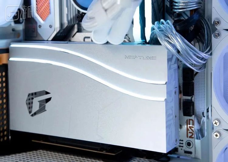 刚拿到这张显卡时,它的造型就让我眼前一亮。相较上代漆黑的色调,全新的RTX 40系列的iGame Neptune采用了银白色的一体式合金外甲,贯穿显卡的双曲线灯组也紧扣了它“亚特兰蒂斯”的设计主题。