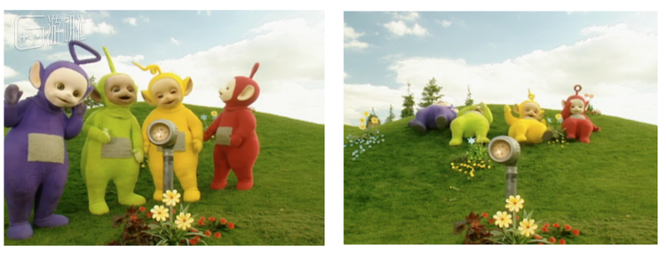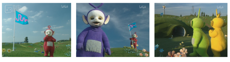 此外,3-4岁的幼儿能分辨基本颜色,但 难以分辨近似颜色 。所以在采用高饱和度、高差异化的原色基础上,《天线宝宝》的 场景设计也采用了大量的对比色 ,比如室外暖色调的花园和室内冷色调的宝宝之家,通过明显的颜色差异强化场景之间的对比。
