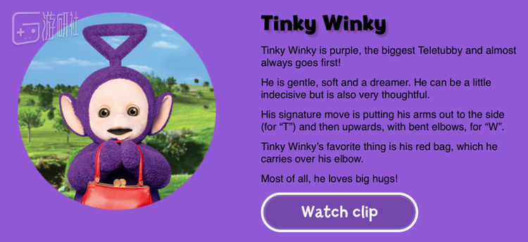 Tinky Winky在《天线宝宝》官网上的介绍 这一结论不断发酵,最终,在成年人的臆想世界里,四位天线宝宝已然凑齐了男性同性恋、女性同性恋、黑人、亚裔的多样性身份,在政治正确的道路上一去不复返。