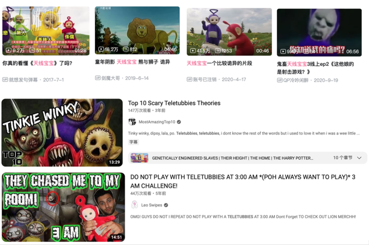 B站与油管上的Cult风格二创 这些解读固然耸人听闻,但不可置否的是,当我们长大之后回看《天线宝宝》,抛去童年滤镜,似乎真的没那么容易复刻当年的快乐了,更多是 陌生甚至“诡异感”。
