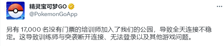 官方对此的解释则令人大跌眼镜:活动当天出现了额外的一万七千名没买票的训练家,这些“不速之客”导致服务器不堪重负。