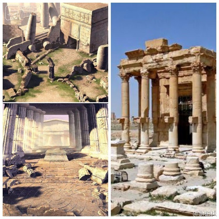 图中左为游戏中的“塔德莫尔”场景,右为现实中的“塔德莫尔”(已被ISIS炸毁)