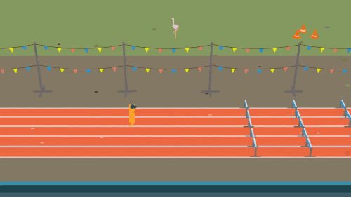 “跨栏”,主人公在行进过程中跑道上会随机出现白色闪烁的键位提示,正确输入对应键位的话就可以继续前进,至于具体是哪个键就得靠你自己找了……