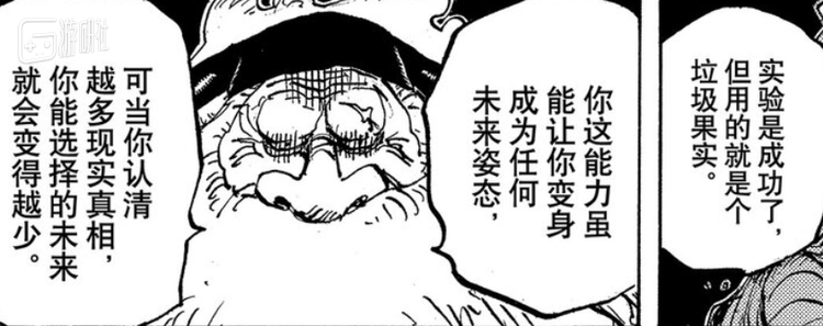 恰巧近期的《海贼王》漫画进一步揭示了“岁岁果实”,其效果是可以让人暂时变身为自己将来想要成为的样子,没有上限、无所不能,但在五老星口中这就是个“垃圾果实”:因为随着人逐渐成长、认清更多现实真相,所谓“未来的自己”也只会越来越平凡普通,越来越弱小。