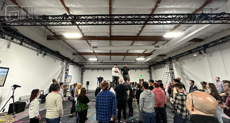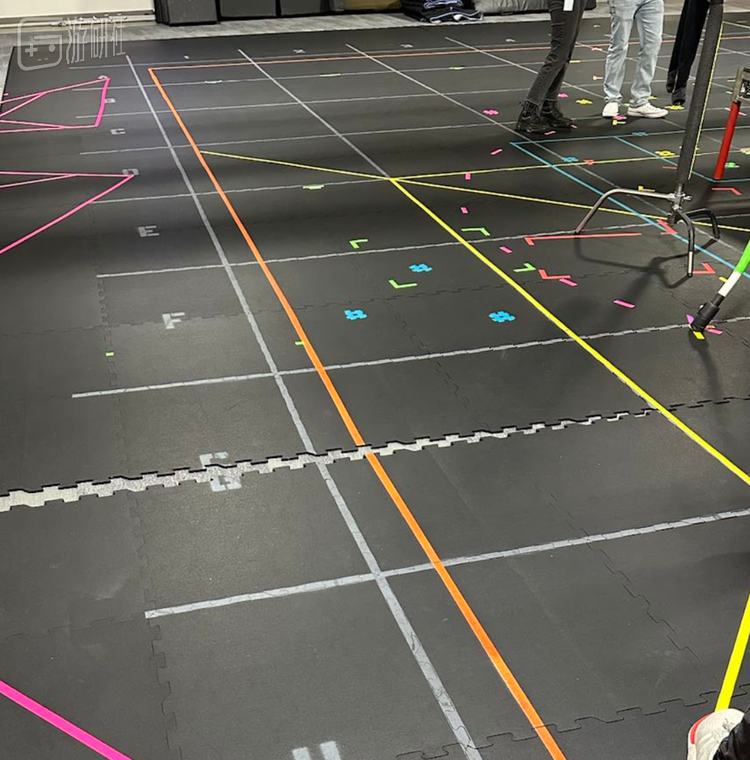 而EA在洛杉矶的动捕工作室就不同了,两个巨大的厂房区域,要负责好几款游戏的动捕开发,地上用胶布沾满了各种各样的辅助线,还有一块专门用蓝色胶布标注出来的APEX载入界面区域。