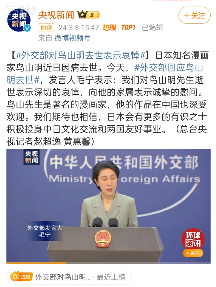 外交部也证实了中国人民对鸟山明先生的感情。
