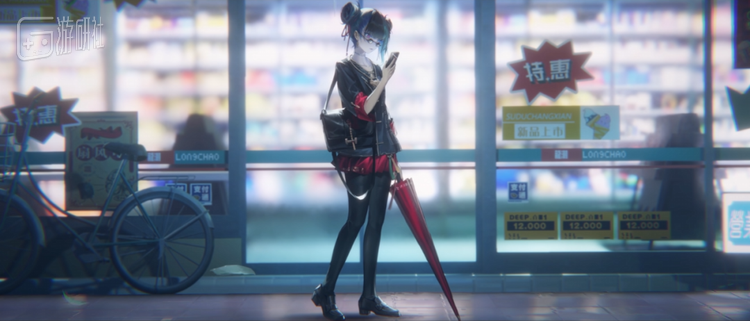 譬如登陆页面的角色“长命锁”(也就是开头提到火锅剧情的主角),红纸伞和红黑配色中式短衫搭配,在便利店门口泛起诡异感十足的红光,颇有种中式怪谈的感觉。