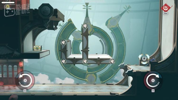 游戏整体的关卡设计算不上复杂,但对于移动端游戏而言,其可交互性和玩法深度完全算得上能让轻度玩家体验到很强的新鲜感了。在一趟主线任务的关卡里,玩家会体验到非常经典的机关旋转解谜、钩锁点平台跳跃等等内容。关卡之间有着非常鲜明的主题和美术风格区隔,始终能营造视觉上的新鲜感。