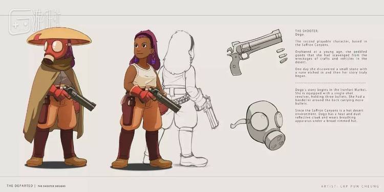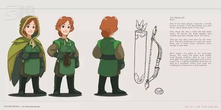画中那位带着兜帽的弓箭手,在Lap Pun Cheung的企划里,是一名叫做Mimi的旅行者,默认游侠职业,自带弓箭天赋,有详细的人设图: