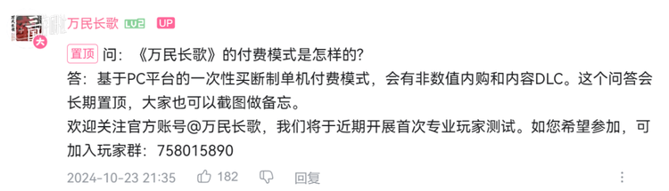 一天后,官方正式回应了这个疑问:《万民长歌:三国》是基于PC平台的一次性买断制单机付费模式。为了给群众吃定心丸,还特别补充道,“这个说法会长期置顶,大家也可以截图做备忘。”