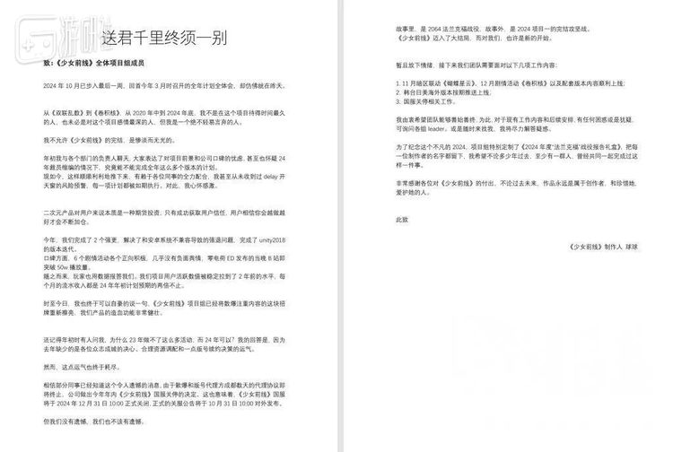 但与此同时,也有一封署名为《少女前线》制作人的内部信开始在小范围内传流传。信的标题为《送君千里终须一别》,其中提到《少女前线》将于今天上午10点宣布国服在年底停服。