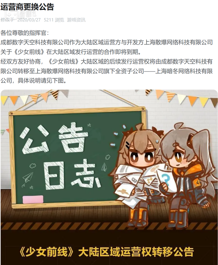 四年后,《少女前线》发布官方通告,表示散爆与数字天空之间关于《少女前线》大陆区域发行运营的合作即将到期,经双方友好协商,之后将转由散爆旗下全资子公司上海暗冬网络负责运营。