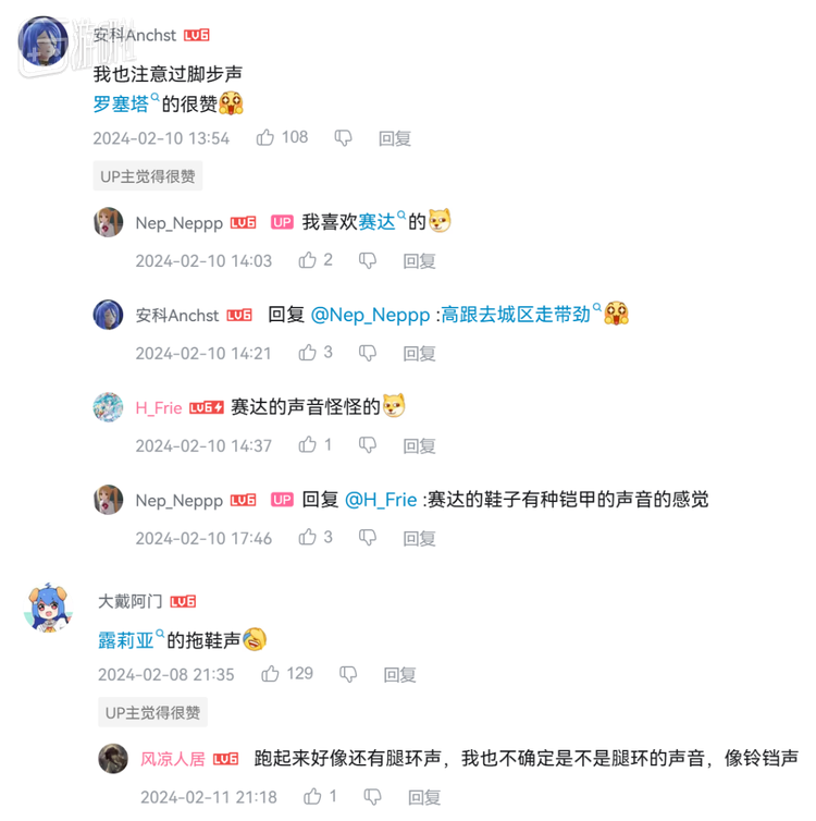 视频来自于一名只有14名粉丝的用户,播放数却有接近6万。评论区里还有其他玩家提及自己注意到脚步声在不同材质地面上也会有所区别,或是伴随着衣物其他佩饰的轻微响动。