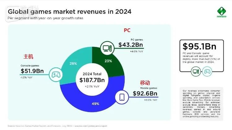 根据市场调研机构Newzoo在8月份发布的统计与预测报告,2024年手机游戏的收入占据全球市场总收入的49%,主机和PC平台则各占28%和24%。其中PC平台的增长最为显著,移动市场的收入份额则自疫情结束之后一直在下降。