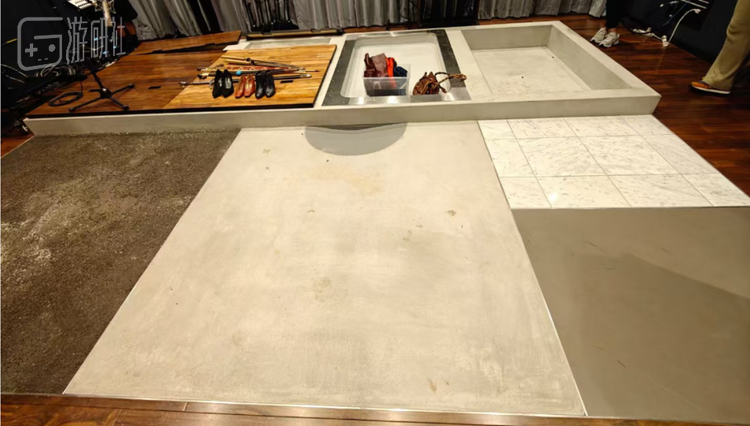 玩家们听到的并非是错觉。走进音效室,就能看到地面上铺有多块不同材质的地板,包括两个深浅不一的水池,一个用于模拟积水音效的浅坑。