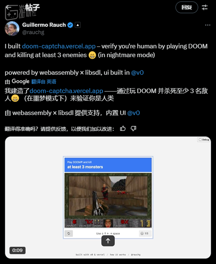 前端云服务平台Vercel的首席执行官Guillermo Rauch在个人推特公布了一项新技术:用《DOOM》来作为验证码,检验对方的操作是否为人类。