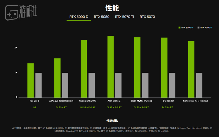 这个对比图细看之下还是有挺多门道的。NVIDIA比较厚道地列出了列出了几种不同的测试场景,而不是完全选用最有利于新显卡的游戏项目。右侧新旧提升最大的几款游戏应用,主要得益于50系显卡独占的DLSS4发挥了巨大作用。左侧提升最小的《孤岛惊魂6》,则不支持DLSS;提升稍小的《瘟疫传说:安魂曲》,则支持到DLSS 3。