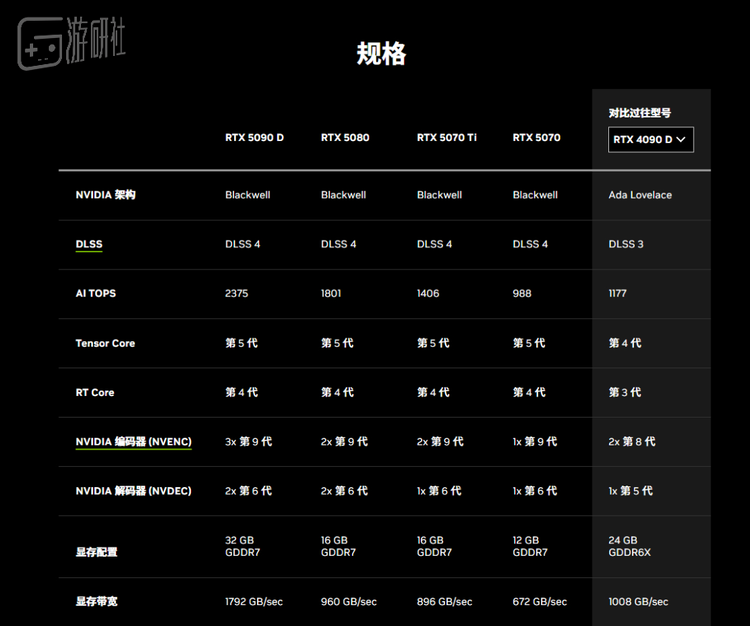 但既然老黄有信心在演讲中把5070和4090划等号,那么显然有额外的法宝,这个法宝便是DLSS4。从NVIDIA在官网上放出的性能规格对比图例,便可见一斑。