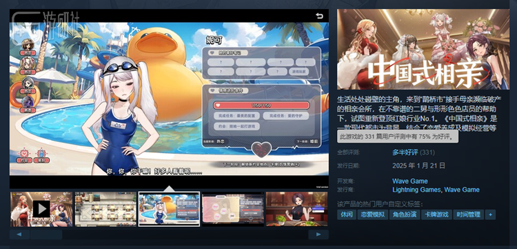 题材立意与实际游戏体验之间的矛盾无疑是缺憾,但游戏的价格和质量上好的立绘配音等似乎又弥补了这一点。因为有视听层面的福利托底,从1月21号上线到现在,《中国式相亲》在Steam上也不乏好评——梦幻总归是一种无功无过的万能解法,毕竟有些太过现实的东西,大家也不必非要在游戏里模拟。