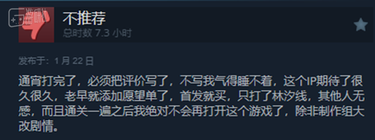 但玩了六七个小时游戏通关后,对游戏期待比较高的部分玩家就开始在Steam上打起了差评——到目前为止,游戏整体的好评率还算良性(75%),但有言辞激烈的差评出现,关键就出在“中国式”三个字上。