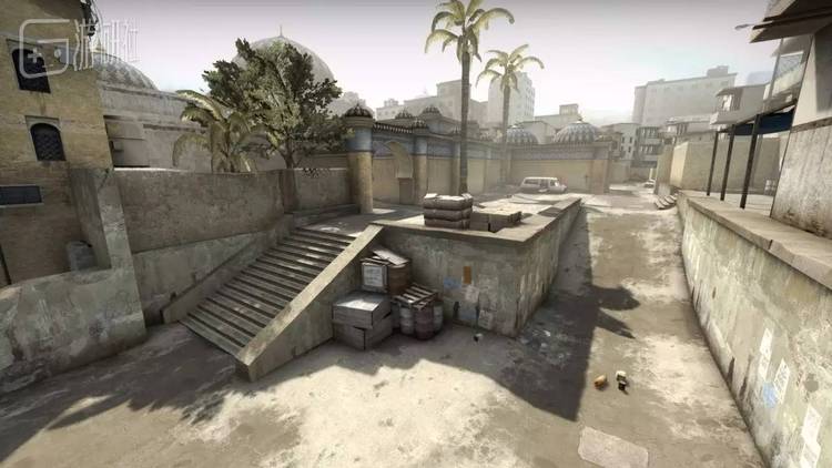 相较于Dust建筑和物品摆放整齐的特点,Dust 2也有一些“出格”的做法,在B点被玩家称为“狗洞”的下面,箱子和碎石随意散落着。为了将两块区域相连接,转角楼梯这样的设计方式也被引入Dust 2。