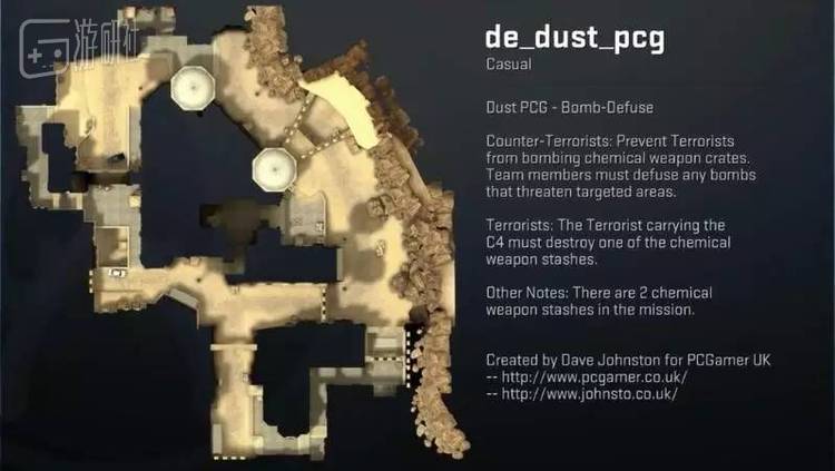 Dave Johnston是英国的一位软件工程师,目前就职于Fireteam公司,1999年,他在CS中制作了Dust地图,并分别在2001年和2005年完成了其续作,这些丰富的制图经历都在他的个人网站记录了下来。