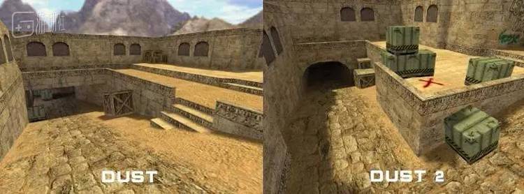 开阔的视野以及明亮的视觉体验,使得Dust深受玩家的喜爱,并且地图简单明了,十分适合新手学习游戏规则,因此迅速成为了游戏中最热门的一张地图。随后这张地图还出现在了CS的各个版本中,画质得到了不断改进。