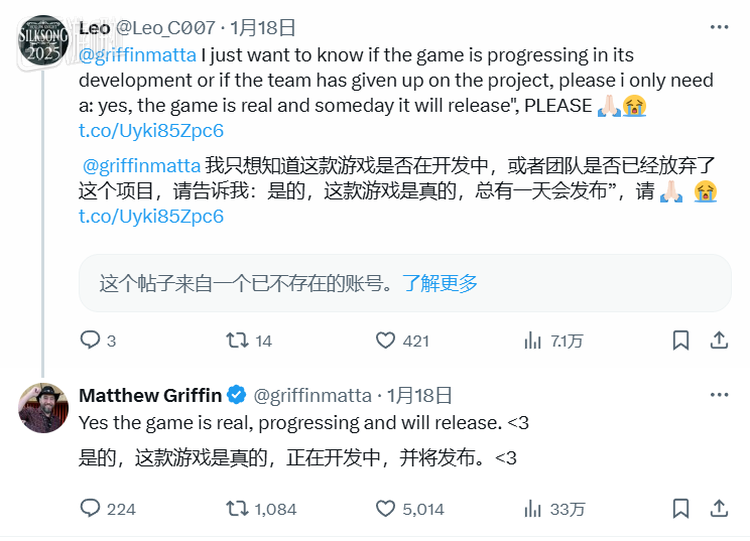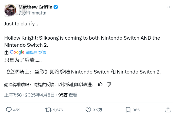 在玩家的追问下,4月8日,Matthew Griffin明确表示《丝之歌》将同时登陆Switch和Switch2平台。