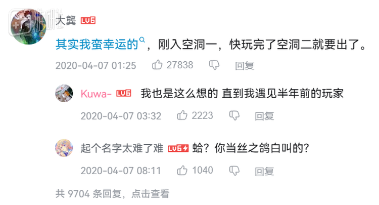 一次次落空的期待和和似乎无尽的等待,促使玩家们以一种自嘲的方式开解彼此,尤其一条发言“我蛮幸运的,刚入空洞一,快玩完了空洞二就要出了”,已经成为了知名打卡景点。