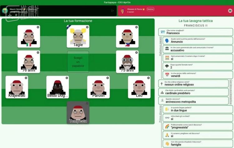 11人的球队对应了11位枢机主教,队长是自己的教皇人选,守门员则是最不可能当选教皇的人选,最后《Fantapapa》会根据所有人的“阵容”,排出教皇选举的“人气榜”。目前已经有超过7万意大利人以足球游戏的形式,间接参与到了教会最重要的仪式中。