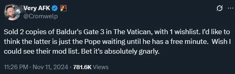 毕竟就连《博德之门3》在梵蒂冈卖出两份时,拉瑞安工作室的发行总监都特意公布了这个喜讯,还不忘顺便提一嘴,除此之外还有第三个梵蒂冈玩家把《博德之门3》加入了愿望单。可见每一份卖出的游戏,在梵蒂冈都算得上一个不大不小的新闻。