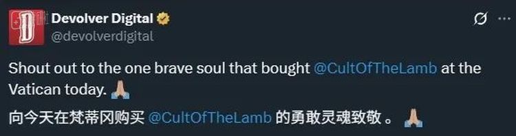 在教皇葬礼刚刚结束、新任教皇选举仍未结束的当下,玩这么一款恶搞邪教的游戏,对于宗教人士来说多少有些叛逆。所以就连Devolver在转发时,都称这位玩家为“勇敢的灵魂”。