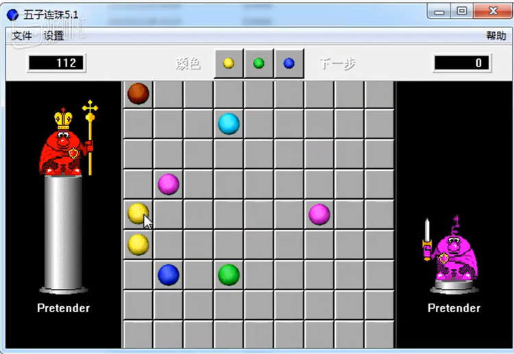 挪动彩色小球,使得五颗相同颜色的彩球排成一条线,则消除;而每次挪动小球一次,都会再随机出现三颗小球。玩家需要不断累积更高的积分,来打败左侧的“国王”。如果画面上所有的空格都被小球填满,那么游戏失败。