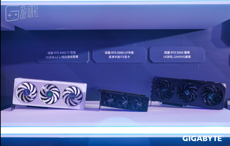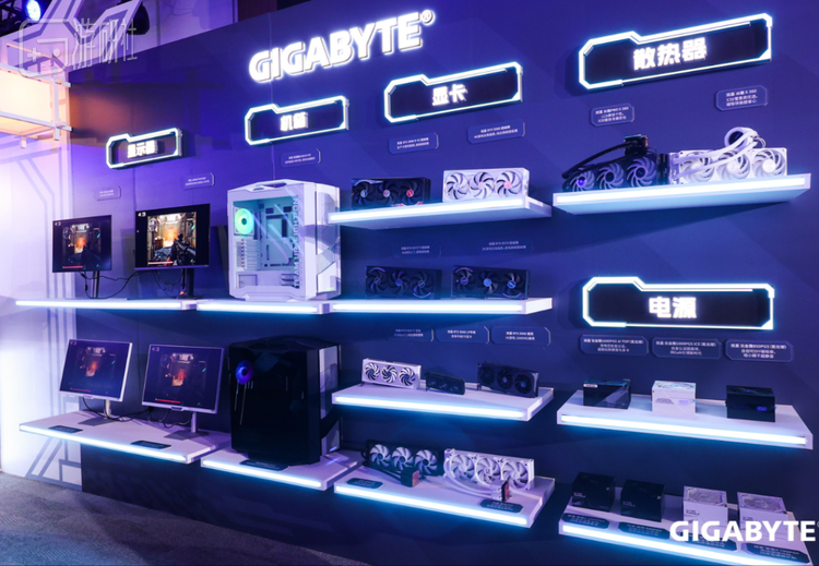 此外,现场还有一整面产品墙,展示了他们今年的不少热门产品。其中包括采用AMD X870E 芯片组的系列主板,INTEL 800系列主板的新产品,技嘉RTX 50系列显卡,以及显示器,水冷和机箱等各条产品线的新产品。