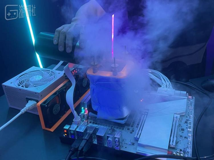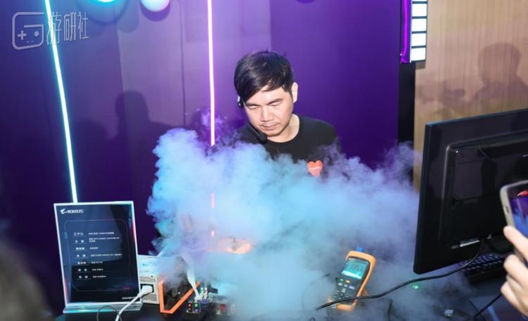 在进入场馆的第一眼,我就看到一个“吧台风”的展区:一个大哥站在吧台后,手里时刻拿着两个保温杯,白色雾气缭绕着整个展位。等到发布会的介绍环节,我才知道原来这个大哥是多项超频世界纪录的保持着“HiCookie”,它手中保温杯里装的也不是鸡尾酒,而是用来超频的液氮。
