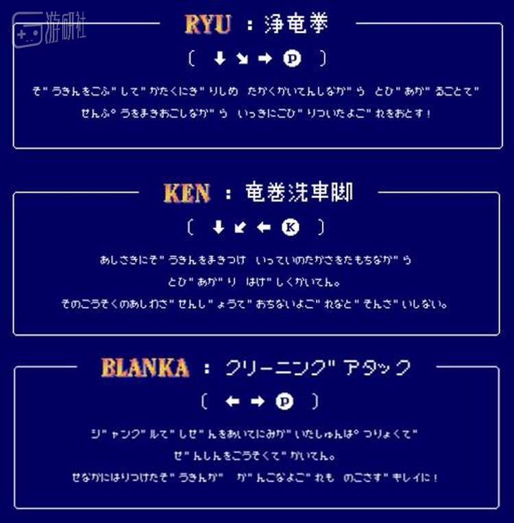 除动画之外,这些角色下面都附有出招表,招式名称恶搞了原作:隆的“净龙拳”,肯的“龙卷洗车脚”,布兰卡的“清洁攻击”,桑吉尔夫的“双重抛光”等等……