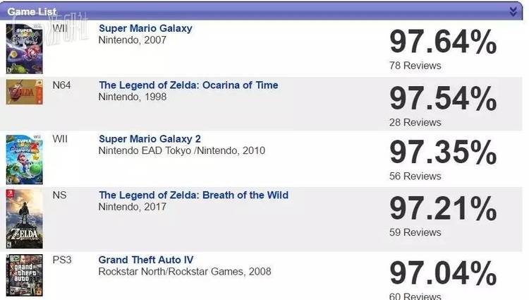 Game Rankings历史所有游戏的综合评分排名,前4皆为任天堂游戏,第五名为GTA4