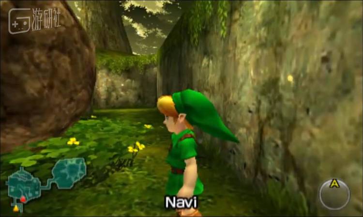 《时之笛》中的Navi,它飞到了路边的一颗石头旁边,告诉林克他可以与这块石头产生互动(此处截图为3DS上的重制版《时之笛3D》)
