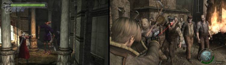 左:《鬼泣》中进入锁定状态时,但丁会掏出手枪对准敌人,右:《生化危机4》中,举起枪会进入越肩视角