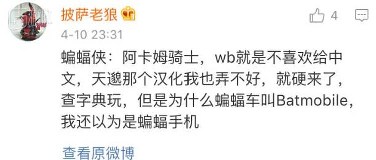 在众多游戏大厂中,WB算是比较晚开始在游戏中加入官方中文的一个,所以此前的“蝙蝠侠 阿卡姆”系列、《中土世界 :暗影魔多》、《疯狂麦克斯》等游戏都没有中文支持。
