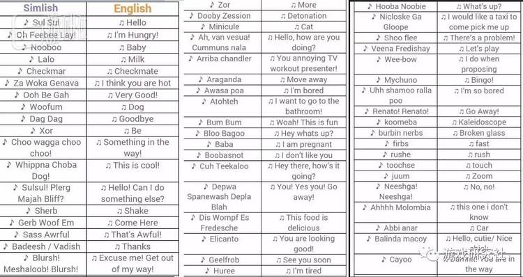 到了《模拟人生3》,终于有了系列最庞大的“模拟语”库,忠粉们结合前两作的语音,立刻就从里面挑出了些常用语,比如“Sul Sul”(你好),“Dag Dag”(再见)等等,有人还在网上整理出了“模拟语”词典,收录了一些常用语的英文翻译,尽管数量有限,远不足以拿来套用成完整文章,好歹是从一门以胡说为准发展而来的语言里,硬拗出了点逻辑出来。