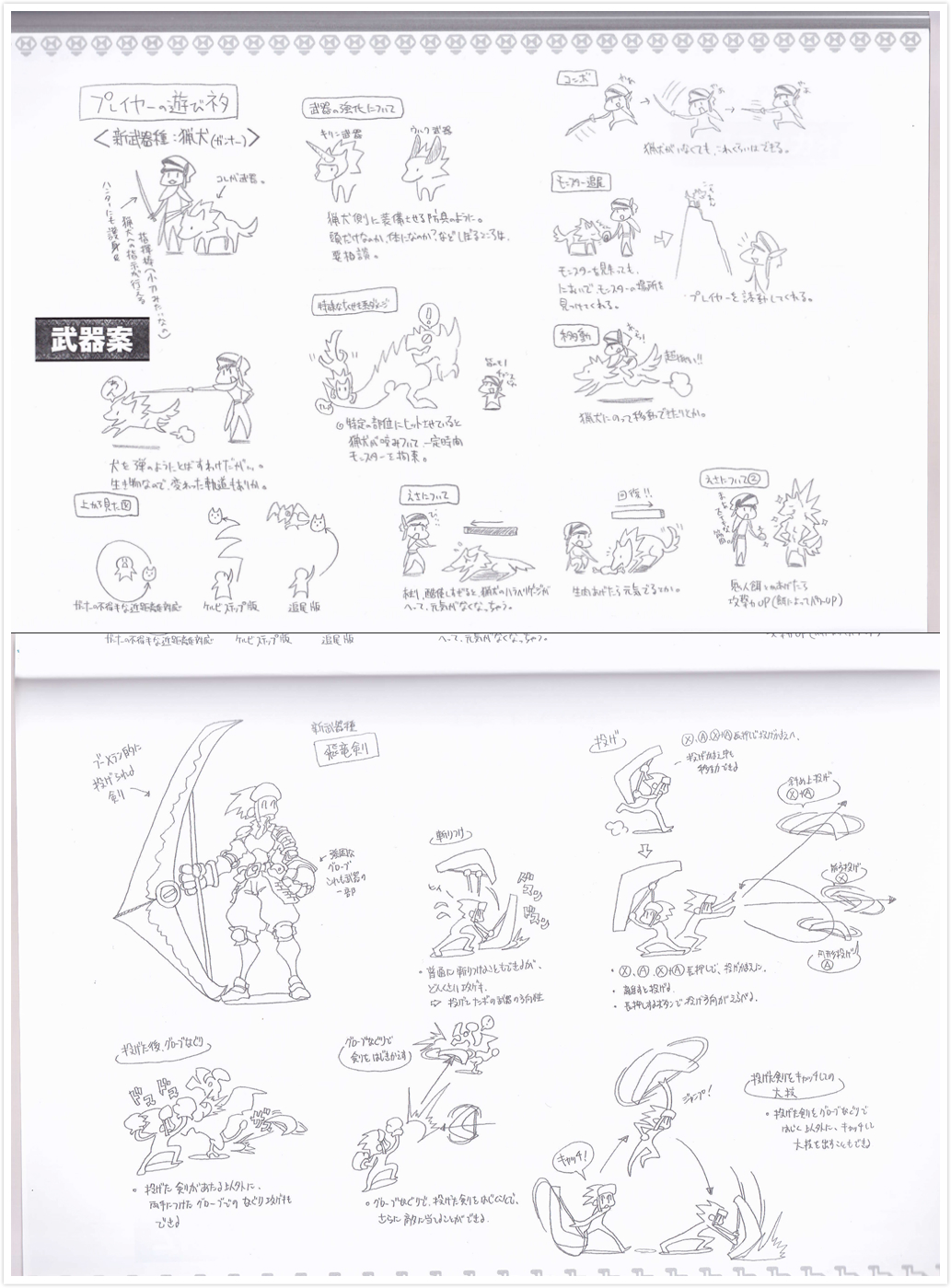 网传在设计《怪物猎人X》的时候,官方还想出了新的脑洞武器,比如可以回收的大型回旋镖,还有猎狗——可以指挥打怪,还可以骑乘,并配有煞有介事的设计图: