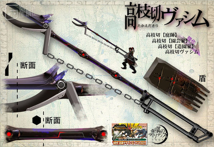 这把以游戏中的操虫棍为原型设计的武器,堪称巴尔巴莱村(MH4G初始村庄)最高锻造工艺结晶,融合了机械和生物的双重设计,靠金属链条驱动上下刀刃,昆虫既可以当盾牌,也可以靠AI驱动实现自主攻击,堪称一件艺术品(我编不下去了……)