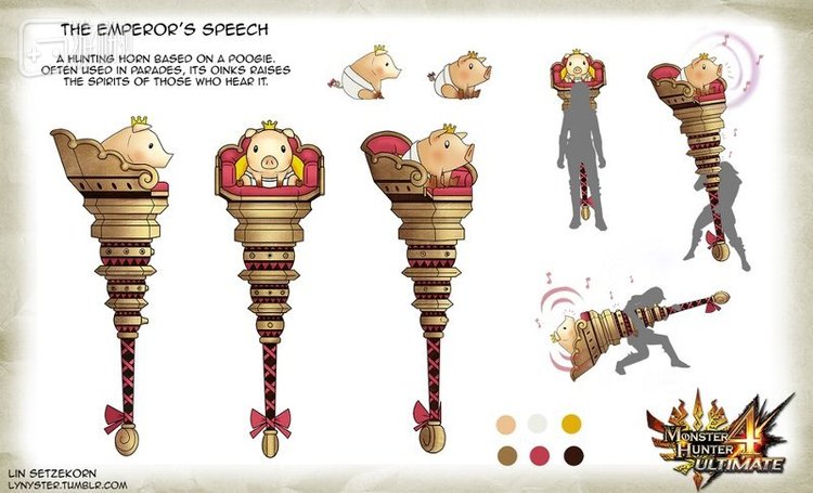 你们该不会以为这还是一把操虫棍吧?!当然不可能让猪飞出去啊!这款武器其实是以狩猎笛为原型的,武器顶端的“皇帝”可以唱出各种旋律,给猎人们带来各种增益,所以才叫做“皇帝的演讲”