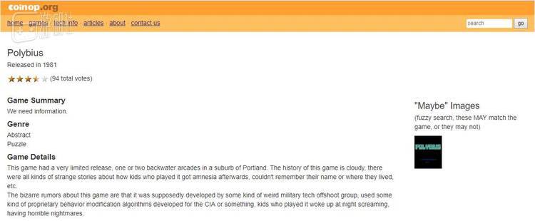 流言的出处,来自于街机资料站coinop.org,上面有《波利比乌斯》的专门介绍页,大体描述就跟传说一样。同时该网站坚称游戏的ROM存在,并提供了那张标题画面截图。
