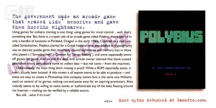 但要把流言变成广为人知的传说,就不可能只靠口耳相传了。游戏杂志GamePro的2003年9月刊上,有一篇“机密和谎言”的文章,报道了当时流传很广的6则游戏流言,然后以“真”,“假”,“不确定”三种方式各自进行了认证。