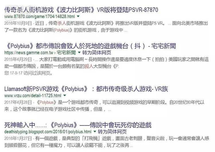 这个传说居然存在了许多年,时不时就会有人跳出来讲一下当年的目击实况,在网上搜一下Polybius,甚至还能找到一些同名同姓的游戏。